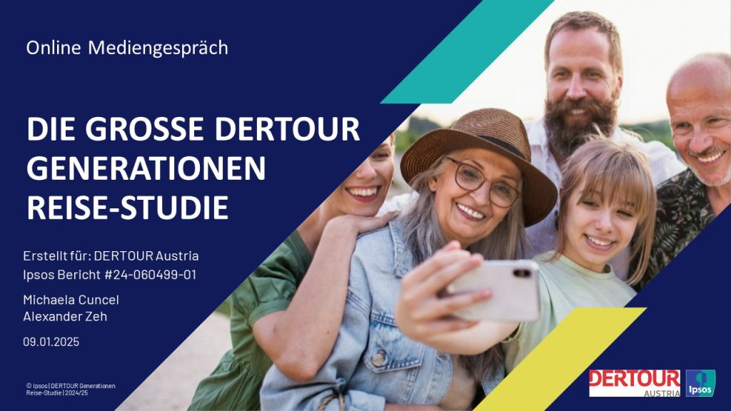 Wie reisen die Österreicher:innen, wohin und wie lange? Welche Gründe halten sie davon ab? Und was hat ihr Alter damit zu tun? Die von DERTOUR Austria Ende 2024 beim Ipsos Institut in Auftrag gegebene Studie liefert Antworten und zeigt die Unterschiede, aber auch die Gemeinsamkeiten zwischen den Generationen auf. Die knapp 1000 Befragten entstammen den Generationen „Baby Boomer“ (zw. 1953 und 1964 geboren), „Generation X“ (zw. 1965 und 1979 geboren), „Generation Y/Millennials“ (zw. 1980 und 1994 geboren), und „Generation Z“ (zw. 1995 und 2010 geboren).